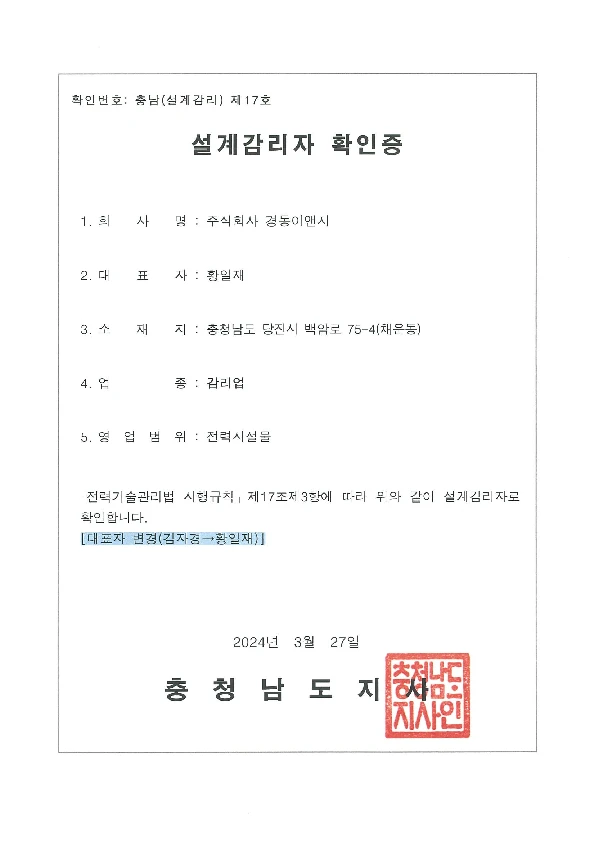 - 전력시설물의 전문설계업 [ 충남(설계) 제2-1-81호 ]