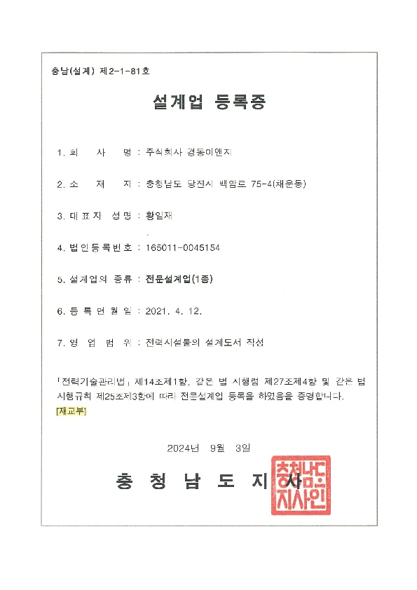 - 전력시설물의 전문설계업 [ 충남(설계) 제2-1-81호 ]